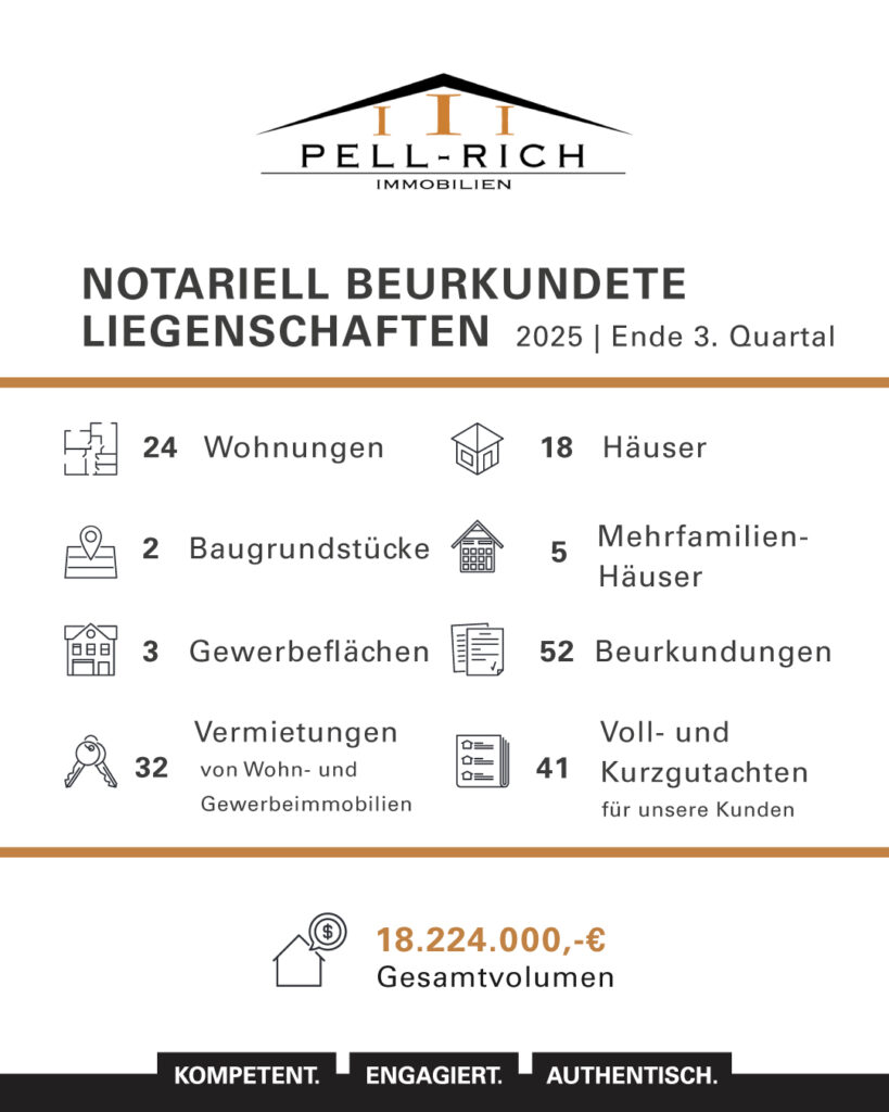 Pell-Rich Immobilien: Starkes Zwischenfazit für das 3. Quartal 2025 Das dritte Quartal 2025 liegt hinter uns – und bei Pell-Rich Immobilien blicken wir mit Stolz auf die bisher erzielten Ergebnisse: Bis Ende September konnten wir insgesamt 52 notariell beurkundete Liegenschaften erfolgreich vermitteln, mit einem Gesamtvolumen von 18.224.000 Euro. Darunter befinden sich: Darüber hinaus haben wir…