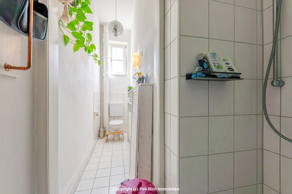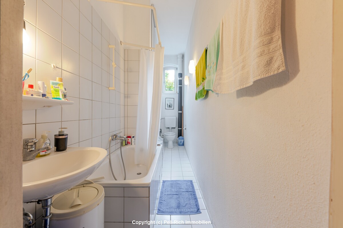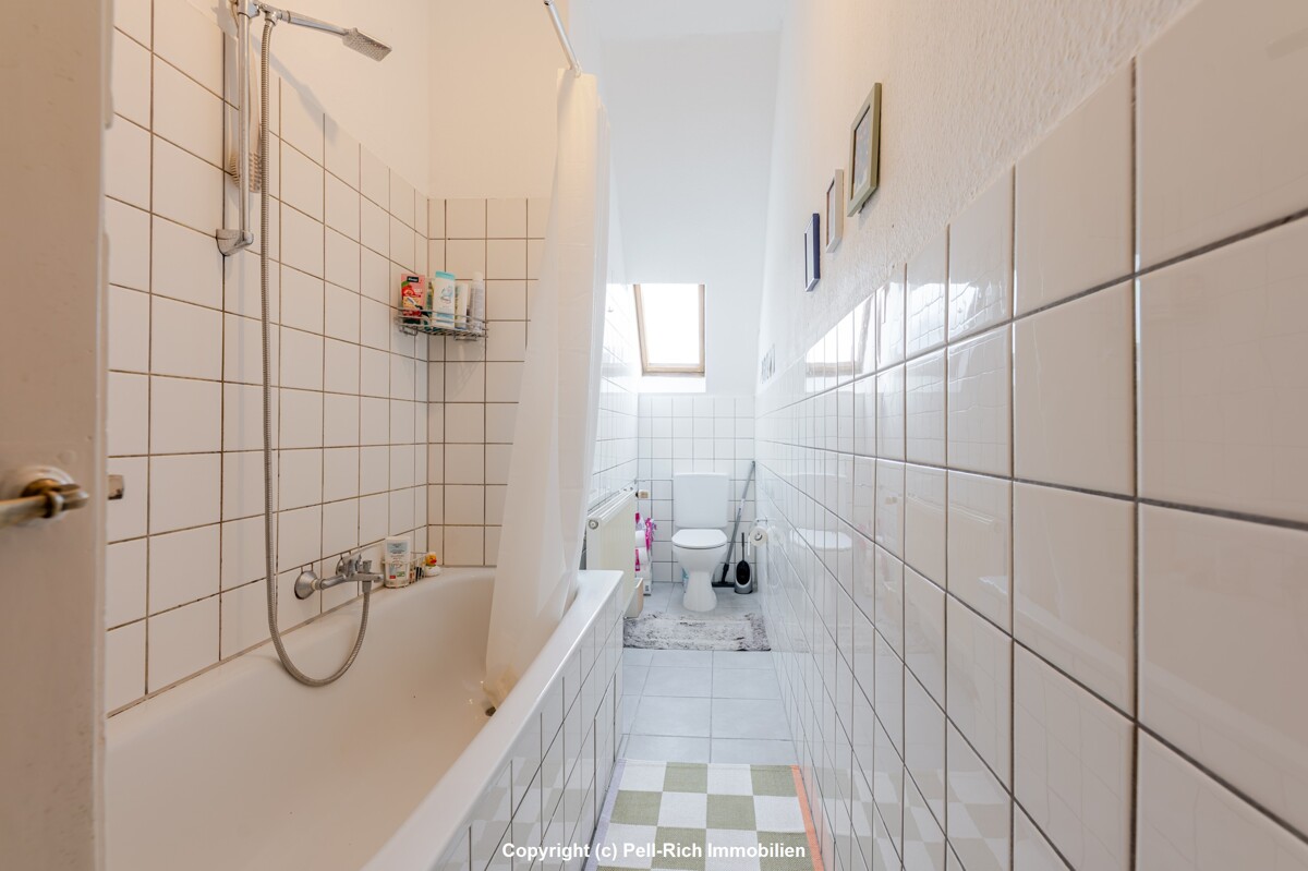 - Tageslichtbadezimmer mit Duschwanne, saniert in den 90er Jahren