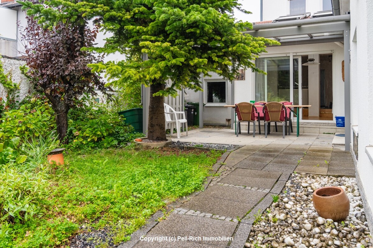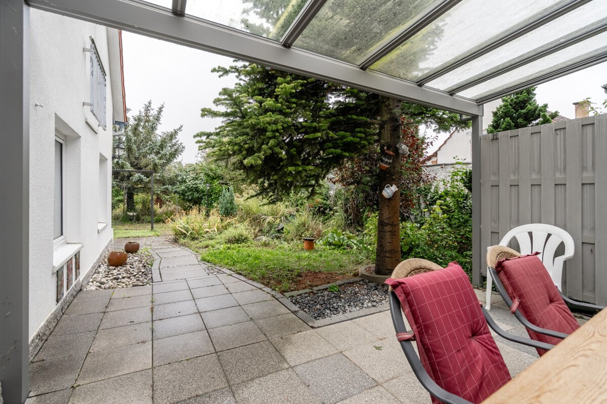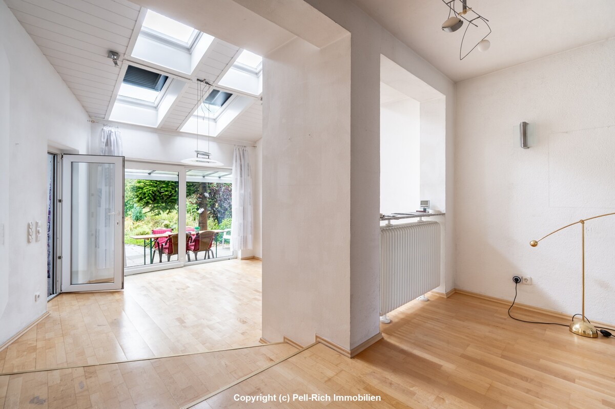 Das Haus verfügt über insgesamt fünf gut geschnittene Zimmer, eine separate Küche mit einer Einbauküche sowie ein helles Wohn-/Esszimmer mit direktem Zugang zur Süd-Terrasse. Die Terrasse ist mit einer Markise (2021) ausgestattet und lädt zum Entspannen im Grünen ein. Ein zusätzlicher Balkon mit Südausrichtung ergänzt das Freiluftangebot.