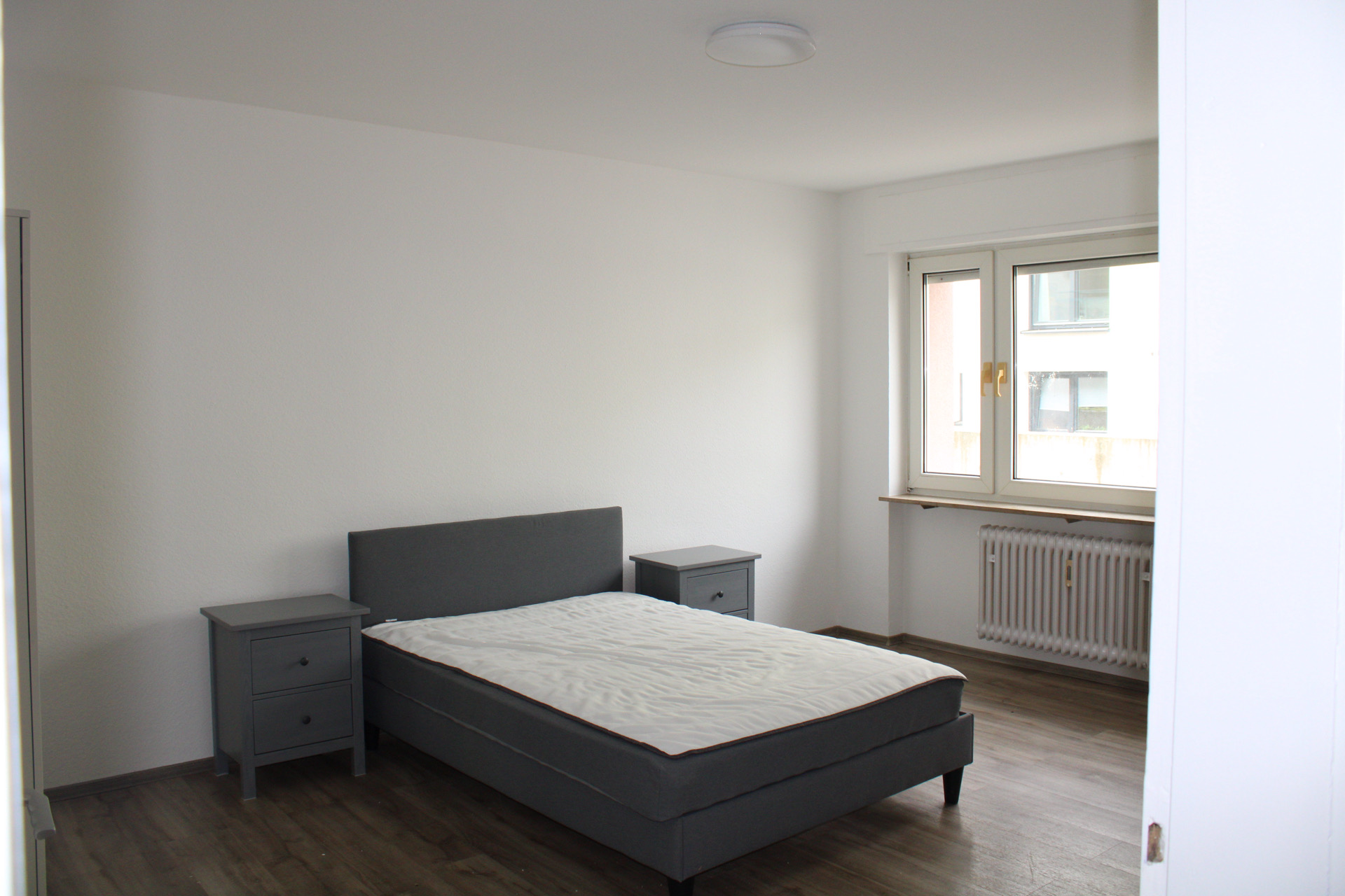 Das Schlafzimmer bietet ausreichend Platz für ein großes Bett und zusätzlichen Stauraum. Das Badezimmer ist mit einer Duschwanne ausgestattet und rundet das Raumangebot sinnvoll ab.