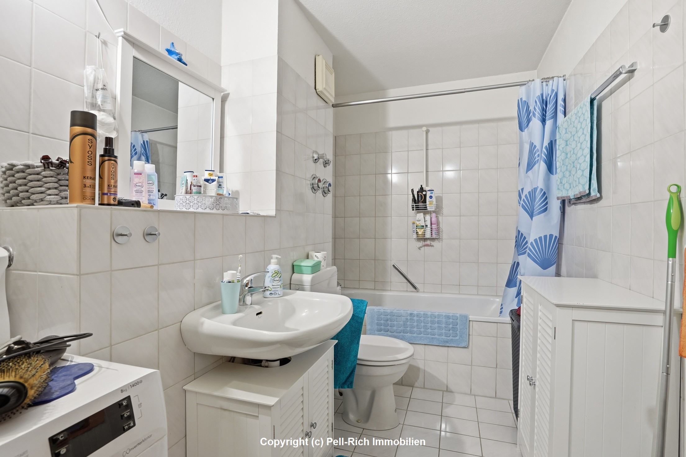 Das innenliegende Badezimmer ist mit einer Duschbadewanne versehen und durch helle, zeitlose Fliesen freundlich und gepflegt gestaltet. Im Badezimmer gibt es zudem einen Waschmaschinenanschluss. Die Beheizung der Wohnung erfolgt über eine Gas-Zentralheizung.