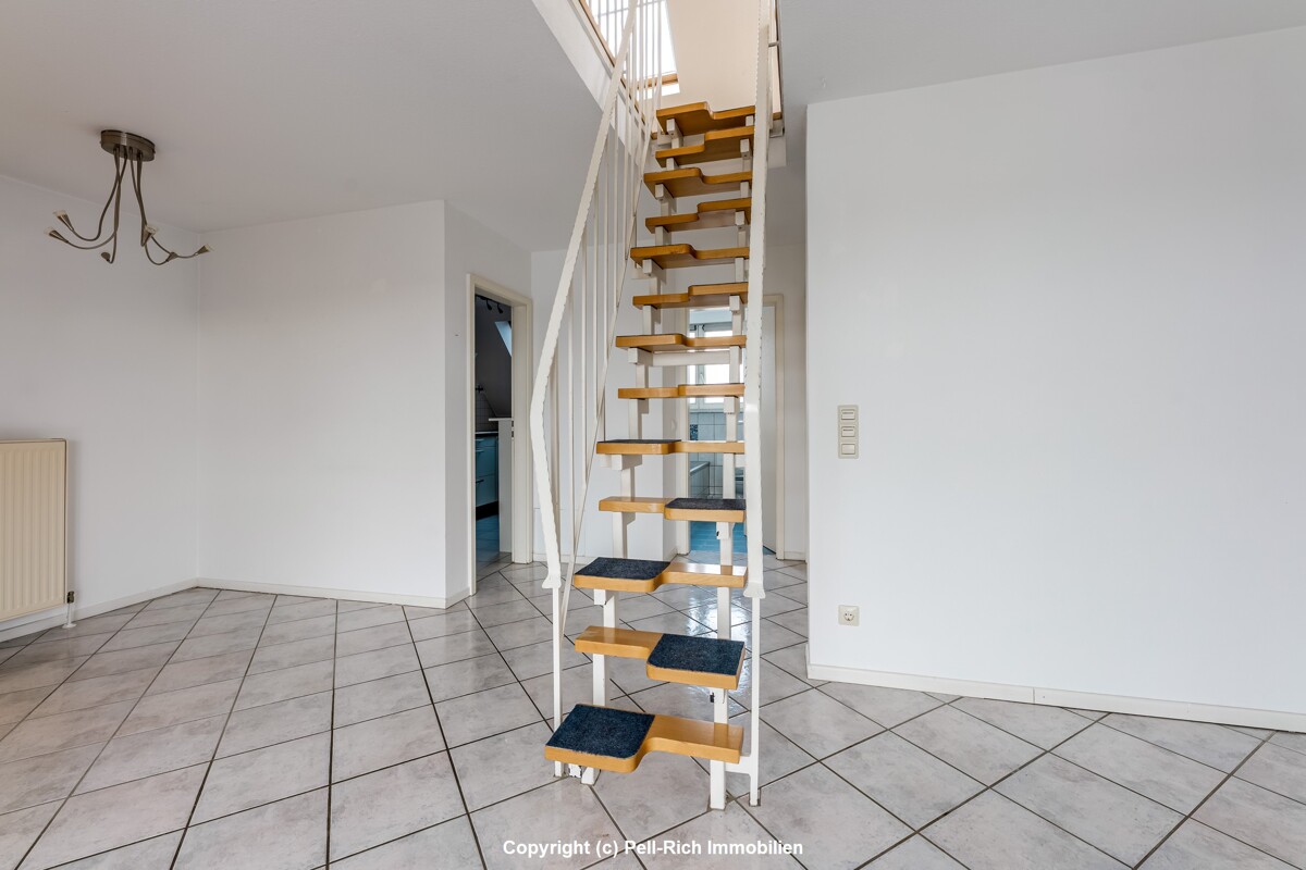 Über die Wohnungstüre eingetreten finden Sie im unteren Bereich der Maisonette-Wohnung das großzügige und helle Wohnzimmer nebst Balkon, ein Schlafzimmer sowie die Küche und eines von zwei Bädern.