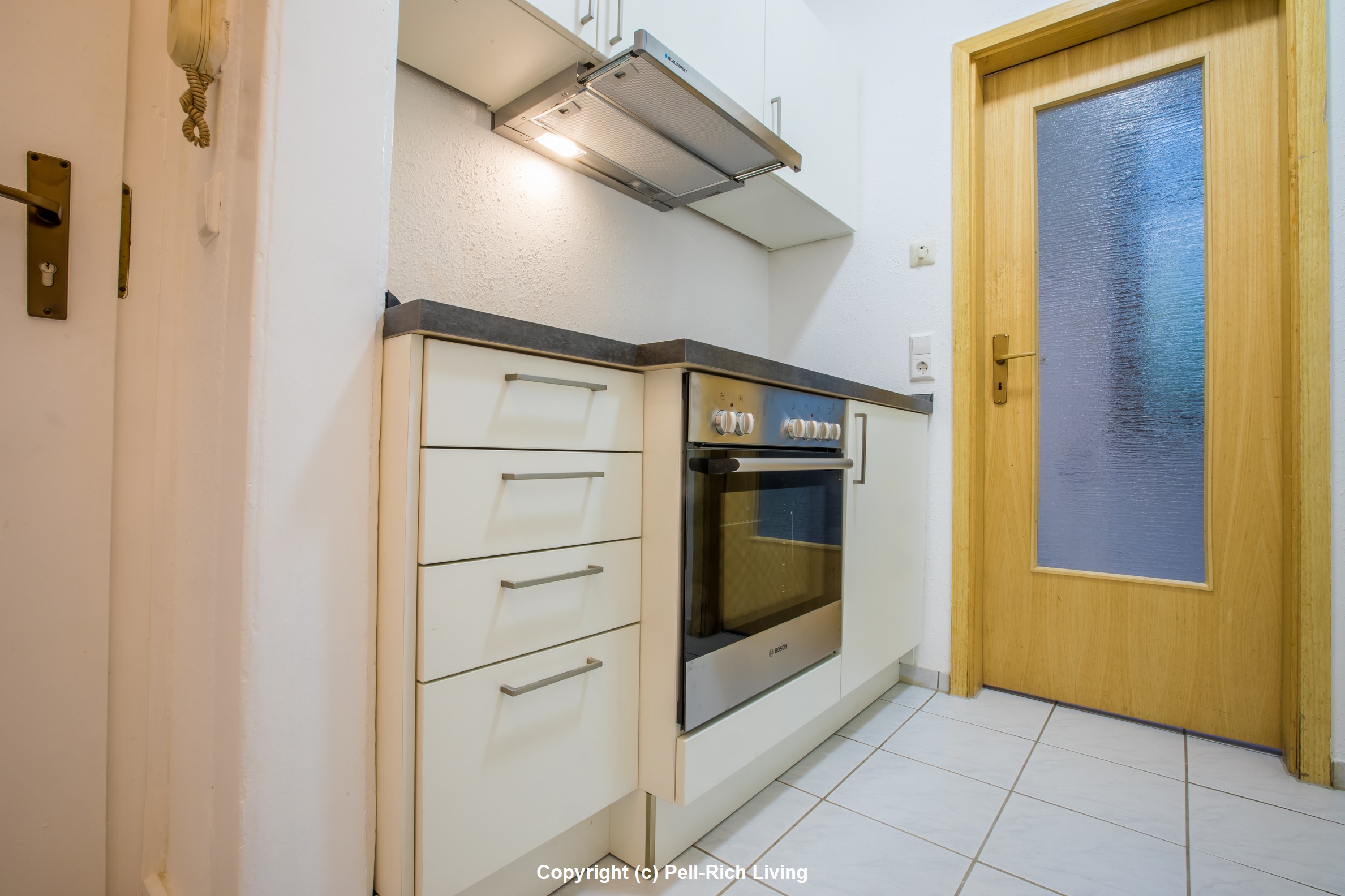 Die neuwertige Einbauküche inkl. Backofen, Kühlschrank, Spülmaschine und Waschbecken ist vollständig mit Geschirr und Besteck ausgestattet.